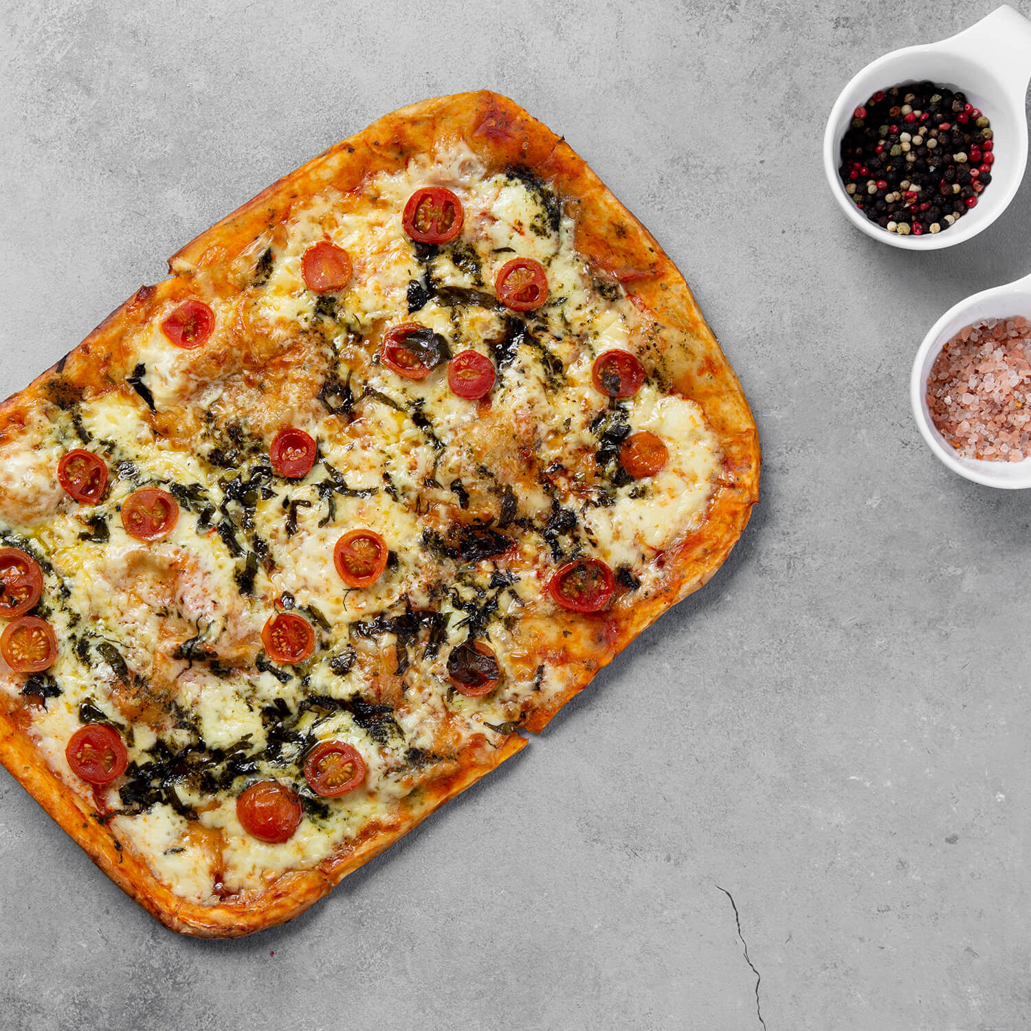 Ingredientes destacados: Masas, Base de salsa de tomates 100% natural, queso Gouda y mozzarella, pesto de albahaca y tomates Cherry, Sal.