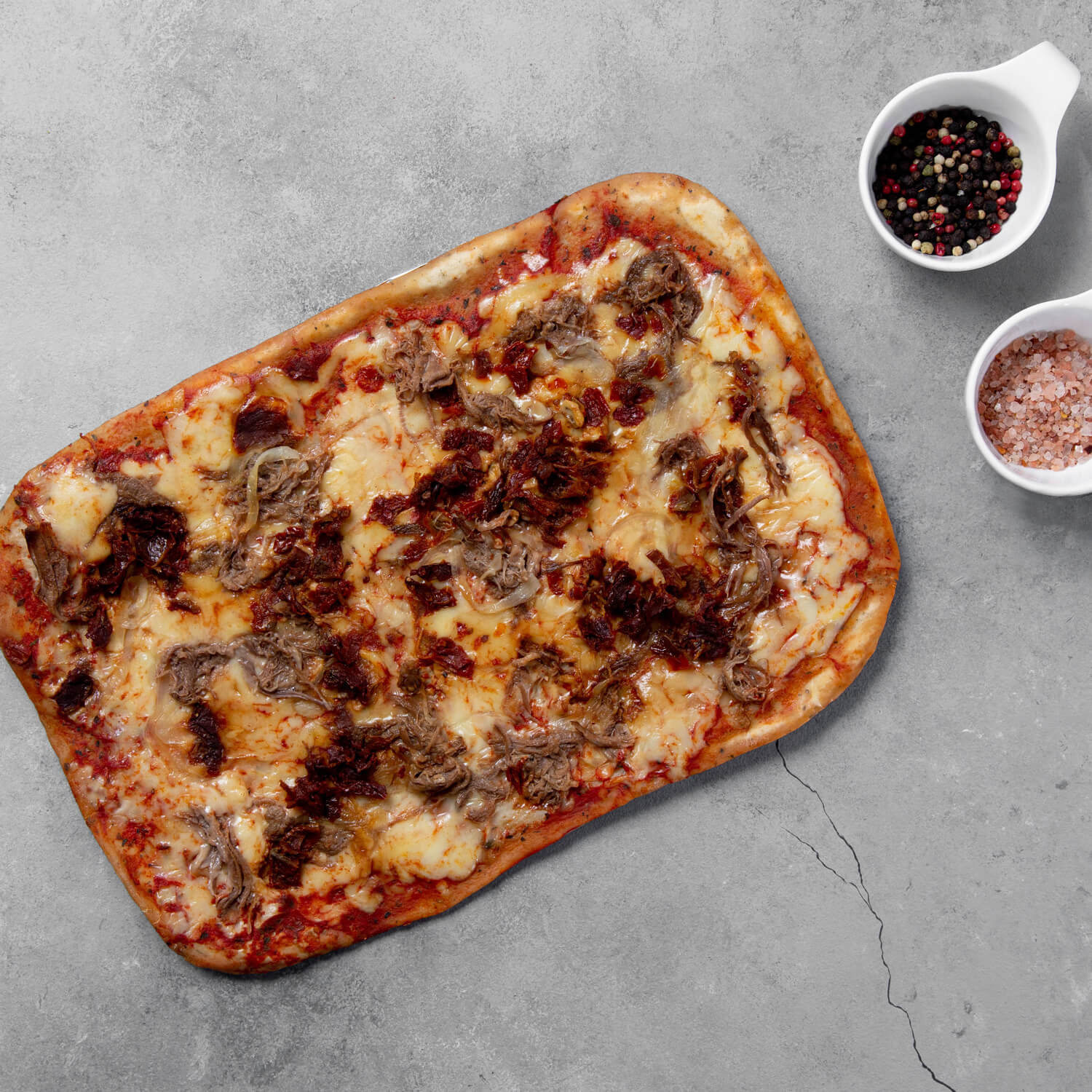Ingredientes destacados: Masas, Base de salsa de tomates 100% natural, queso gouda y mozzarella, carne mechada de plateada, cebolla morada caramelizada.